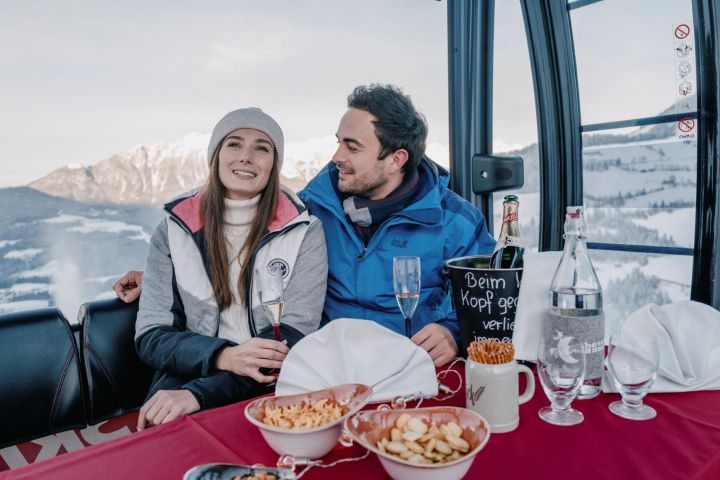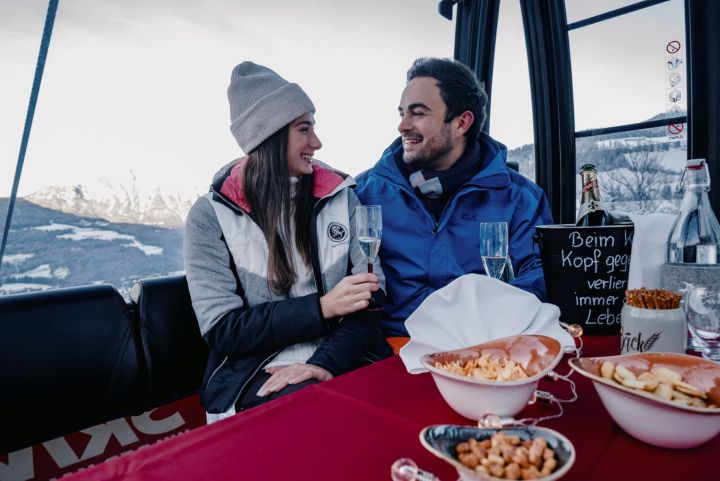 Erlebt genussvolle Momente in der Hexenwasser Gondelbahn. Unter Freunden könnt ihr Euch beim grandiosen Blick auf das erleuchtete Skigebiet und das funkelnde Söll zurücklehnen und eine Flasche eisgekühlten Sekt genießen. Macht es Euch in Eurer privaten Genussgondel so richtig gemütlich und nehmt Euch bis zu zwei Stunden Zeit über Söll zu schweben. Das Ticket zum Nachtskifahren ist nicht im Preis enthalten, aber der Ausstieg am Berg für eine einmalige gemütliche Rodelpartie ist möglich.