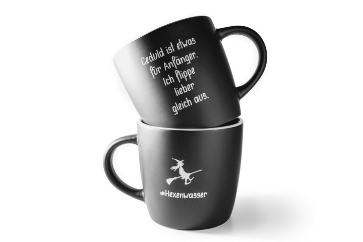 Schwarze Edelstahl-Trinkflasche mit Trage-Deckel aus Bambus mit gelaserter Hexenwasserhexe