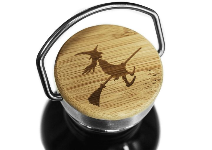 Produktbeschreibung: Schwarze Edelstahl-Trinkflasche mit Trage-Deckel aus Bambus mit gelaserter Hexenwasserhexe. Füllmenge: 750 ml.
